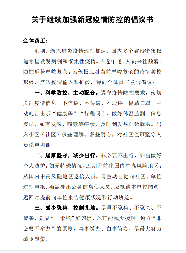 關(guān)于繼續(xù)加強(qiáng)新冠疫情防控工作的倡議書